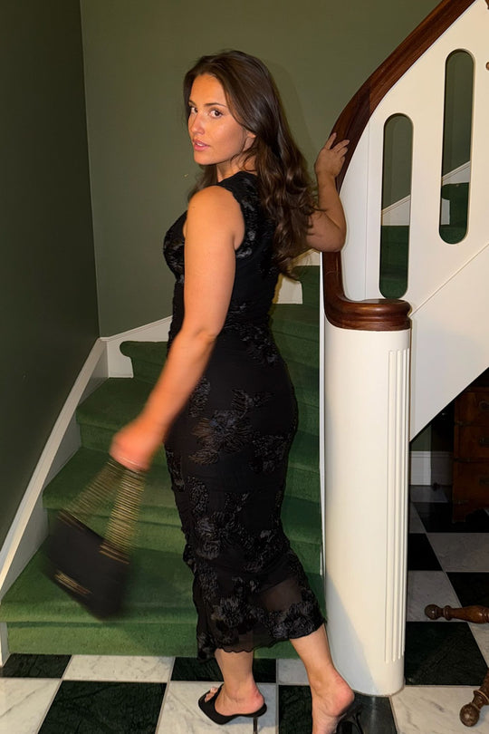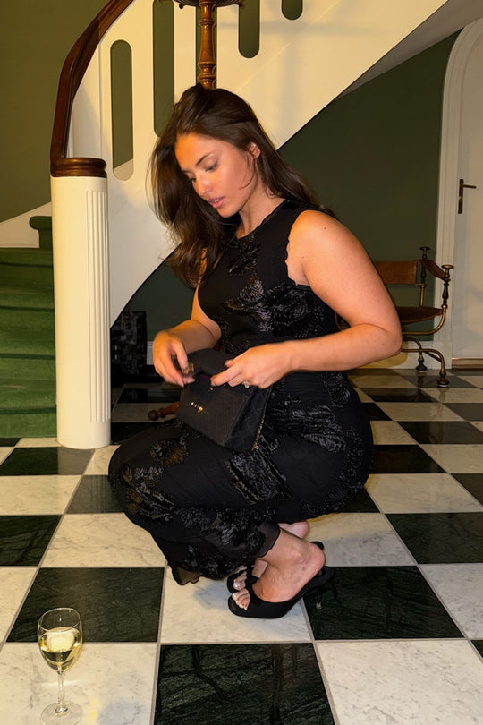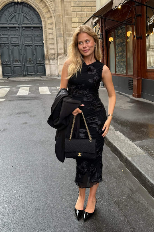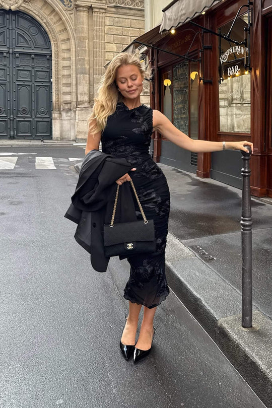 Elegant lång klänning i svart med en figursydd siluett. Klänningen har korta ärmar och en rund halsringning. Den är utsmyckad med 3D-floral detaljer genomgående, vilket ger extra karaktär till designen. Kanterna på klänningen har volangdetaljer, och ryckningen på sidorna gör att du kan justera längden för en kortare look.