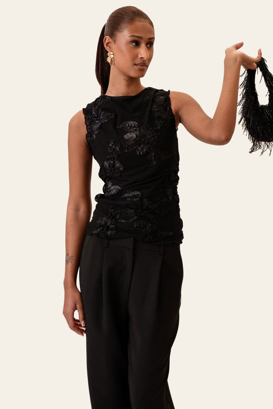 Tätt sittande svart blommig mesh-topp med 3D-blomdetaljer. Toppen är tillverkad av stretchig mesh och har rynkor på sidorna och små volanger vid axlarna.