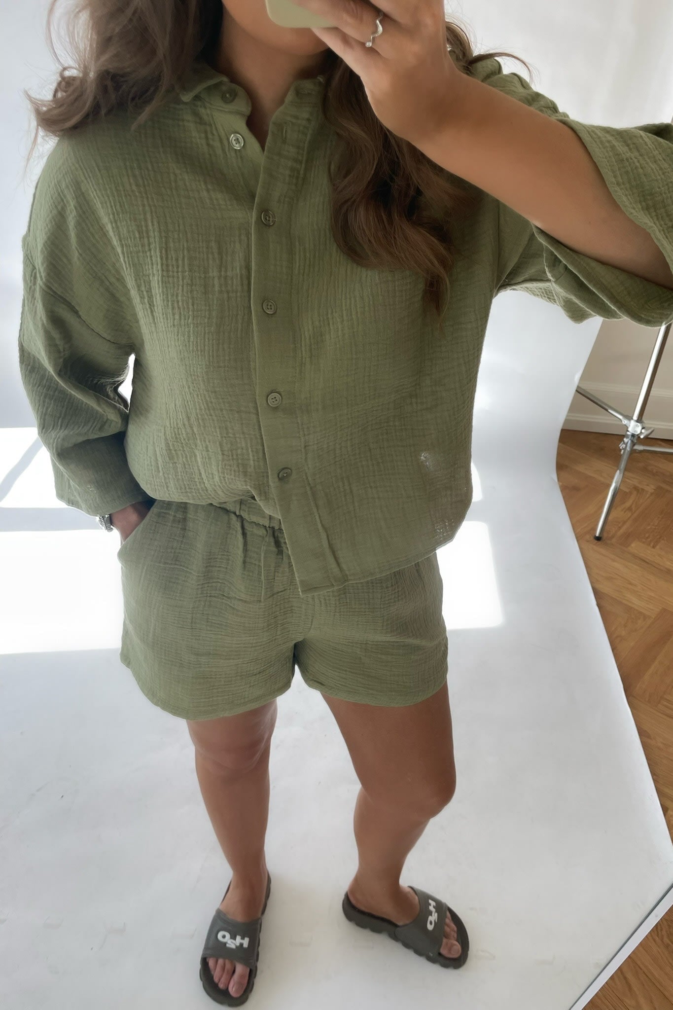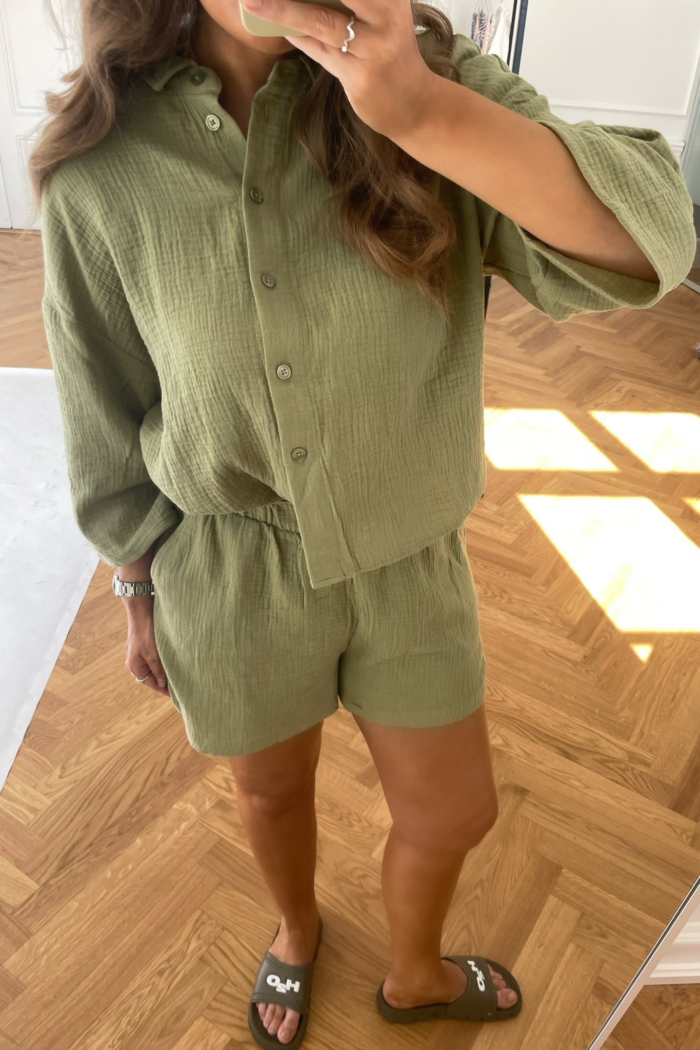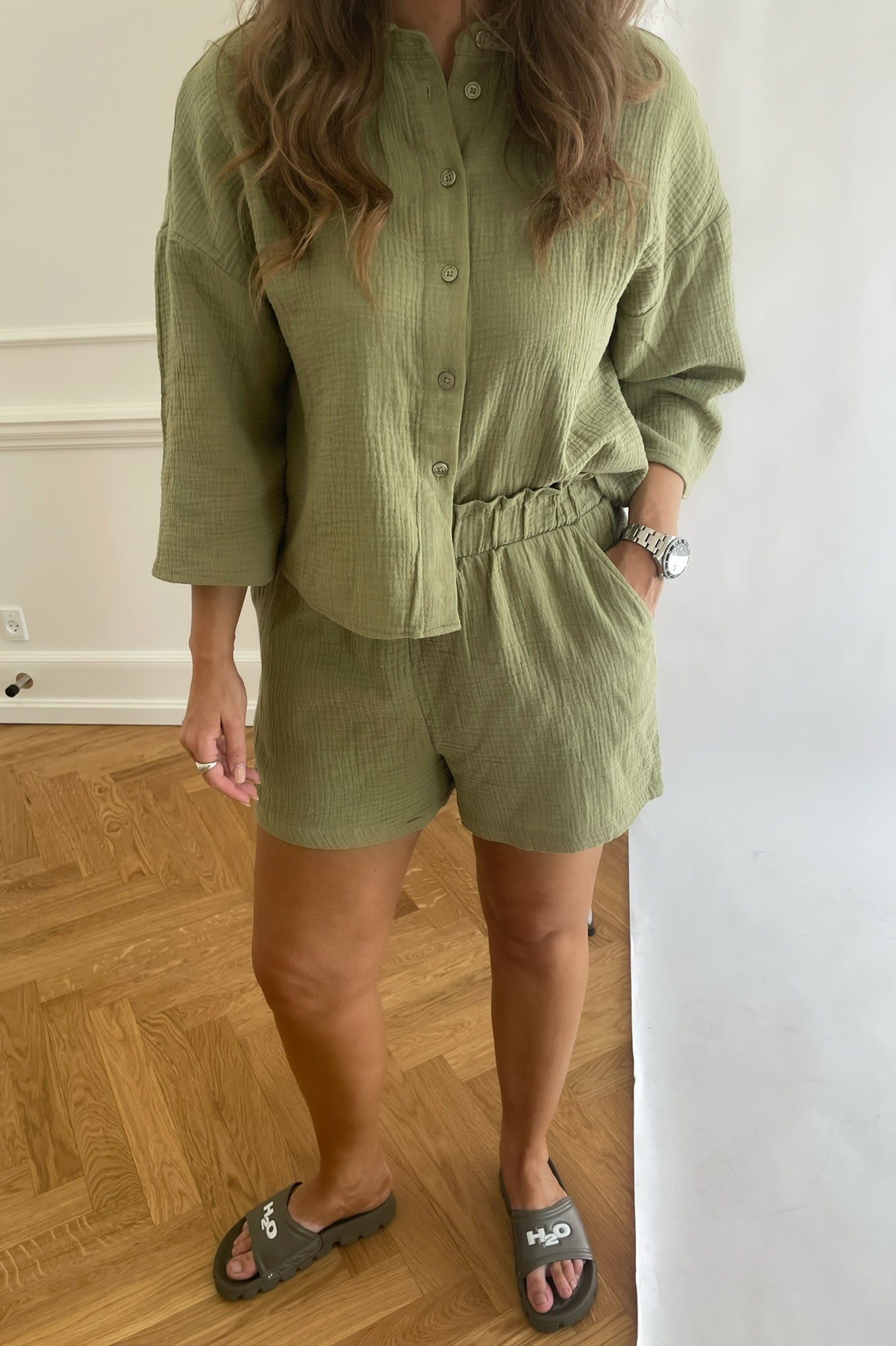 The perfect green shirt for summer with buttons and short sleeves, match it up with Natali shorts.