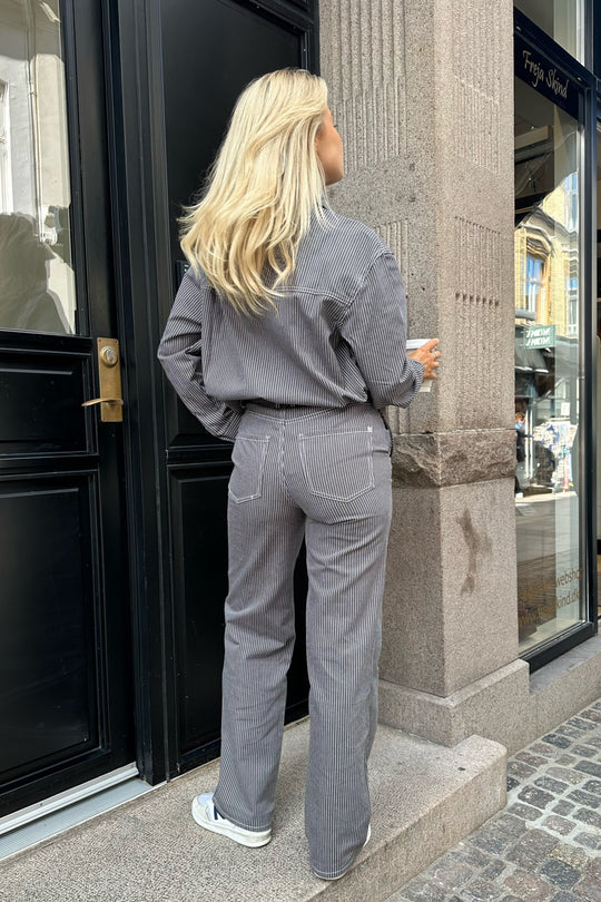 Grey jeans in denim with white stripes, stitching and pockets. Style it with the Nehva shirt.