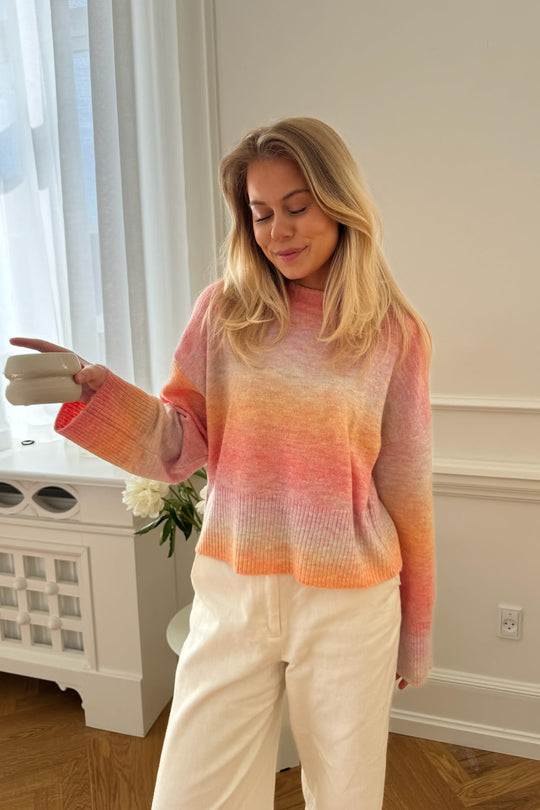Stickad tröja med en blandning av rosa och orange ränder som skapar färgspel, rund hals och långa ärmar.