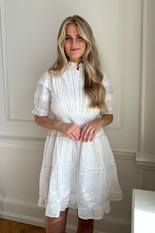 White dress with embroidery details, high neck with buttons and short sleeves.
