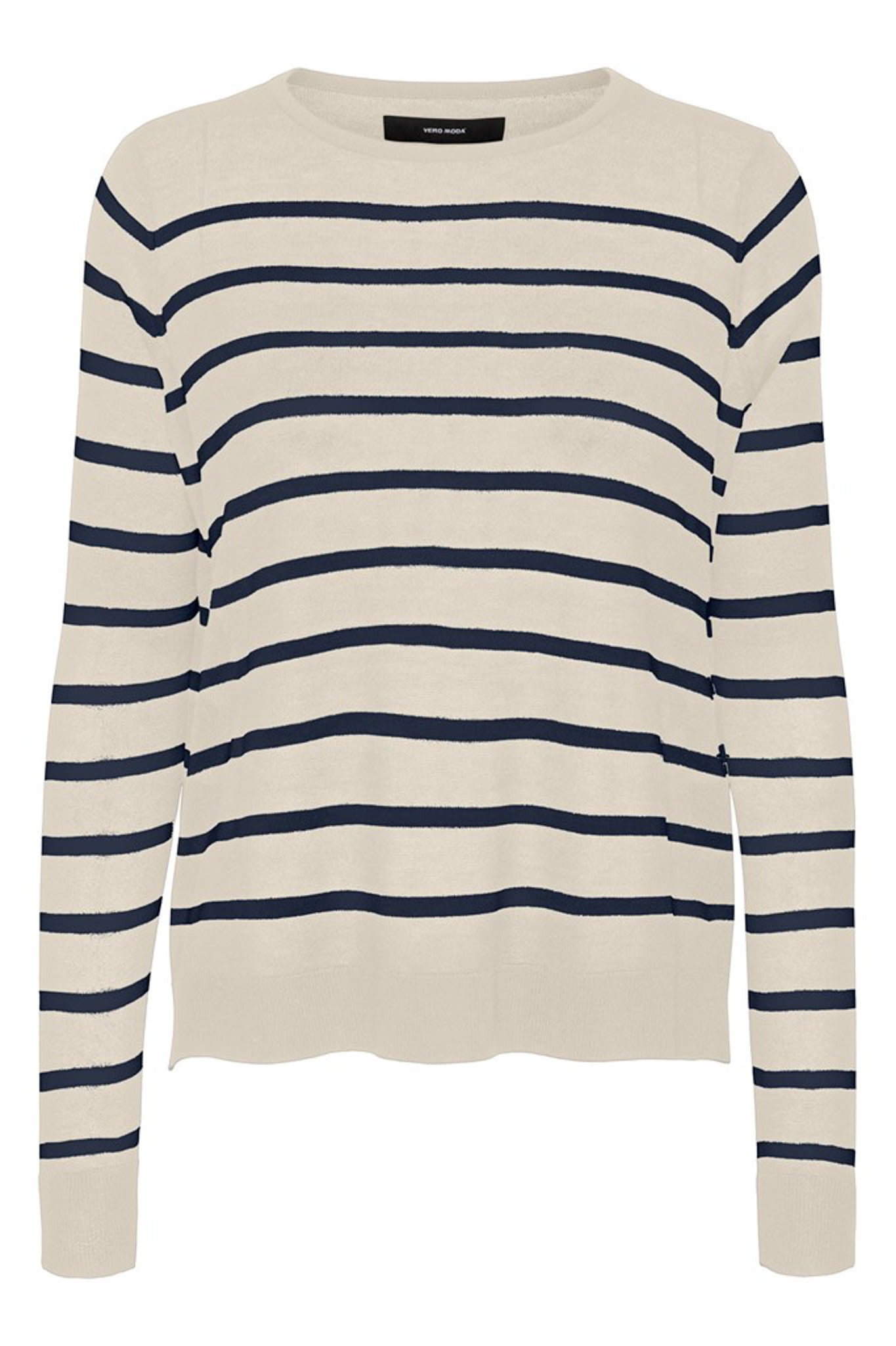 Beige pullover with black stripes, long sleeves and a loose fit.