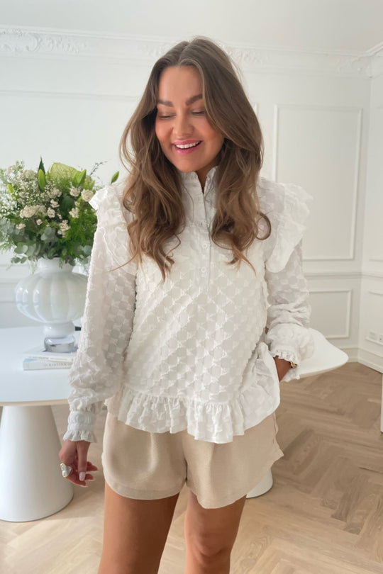 White shirt in a textured material and frills in the bottom, cuffs, shoulders, neck.