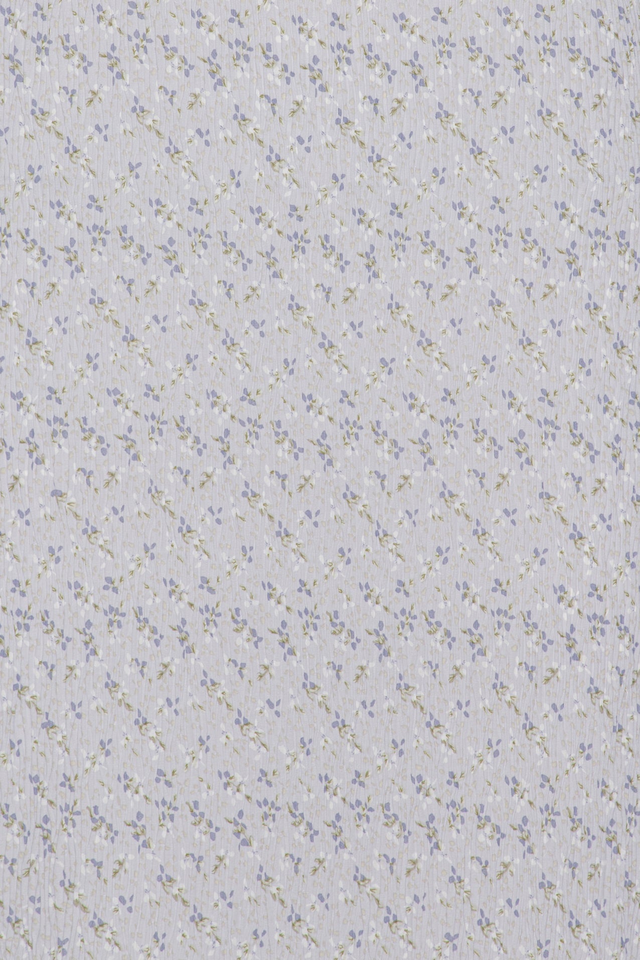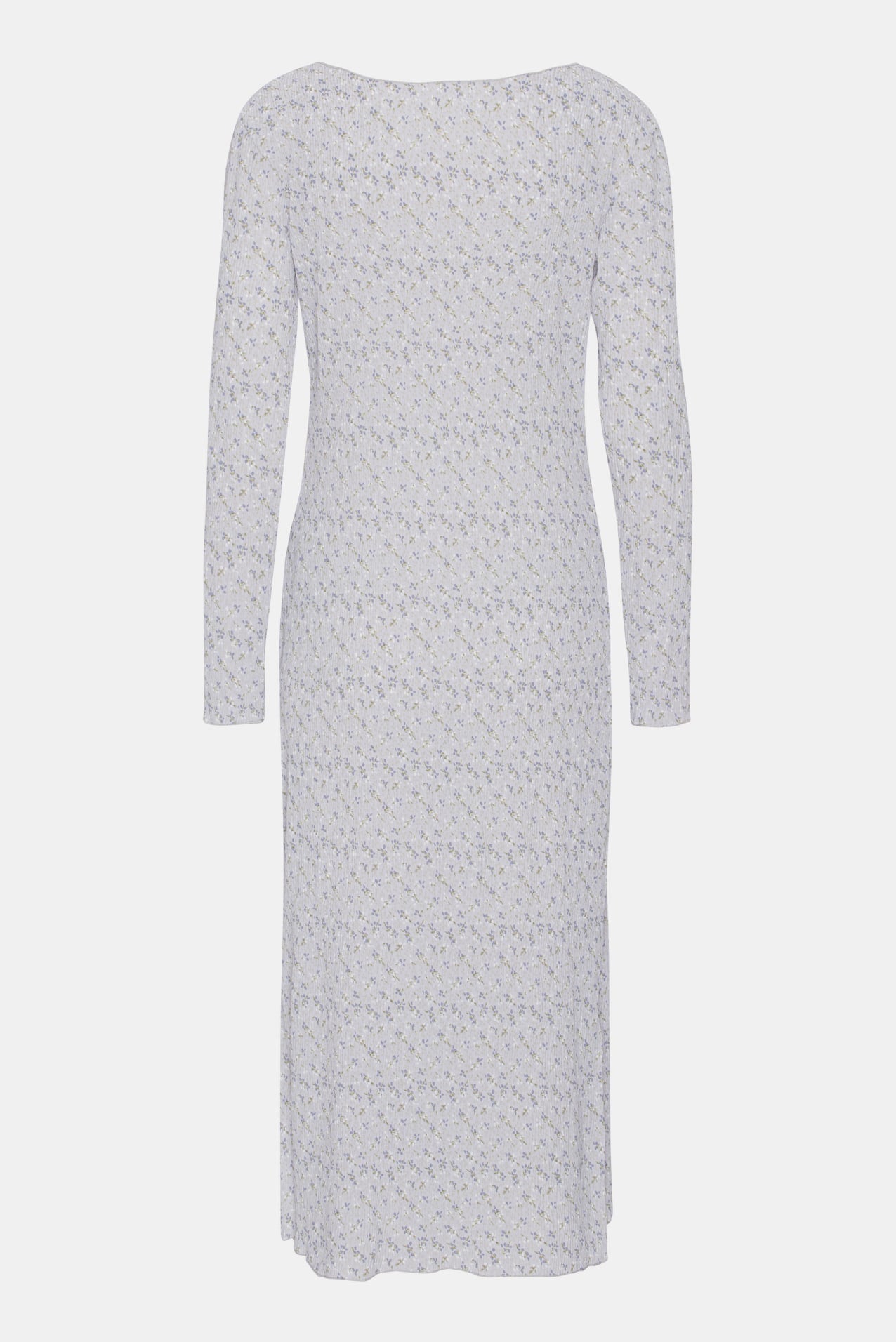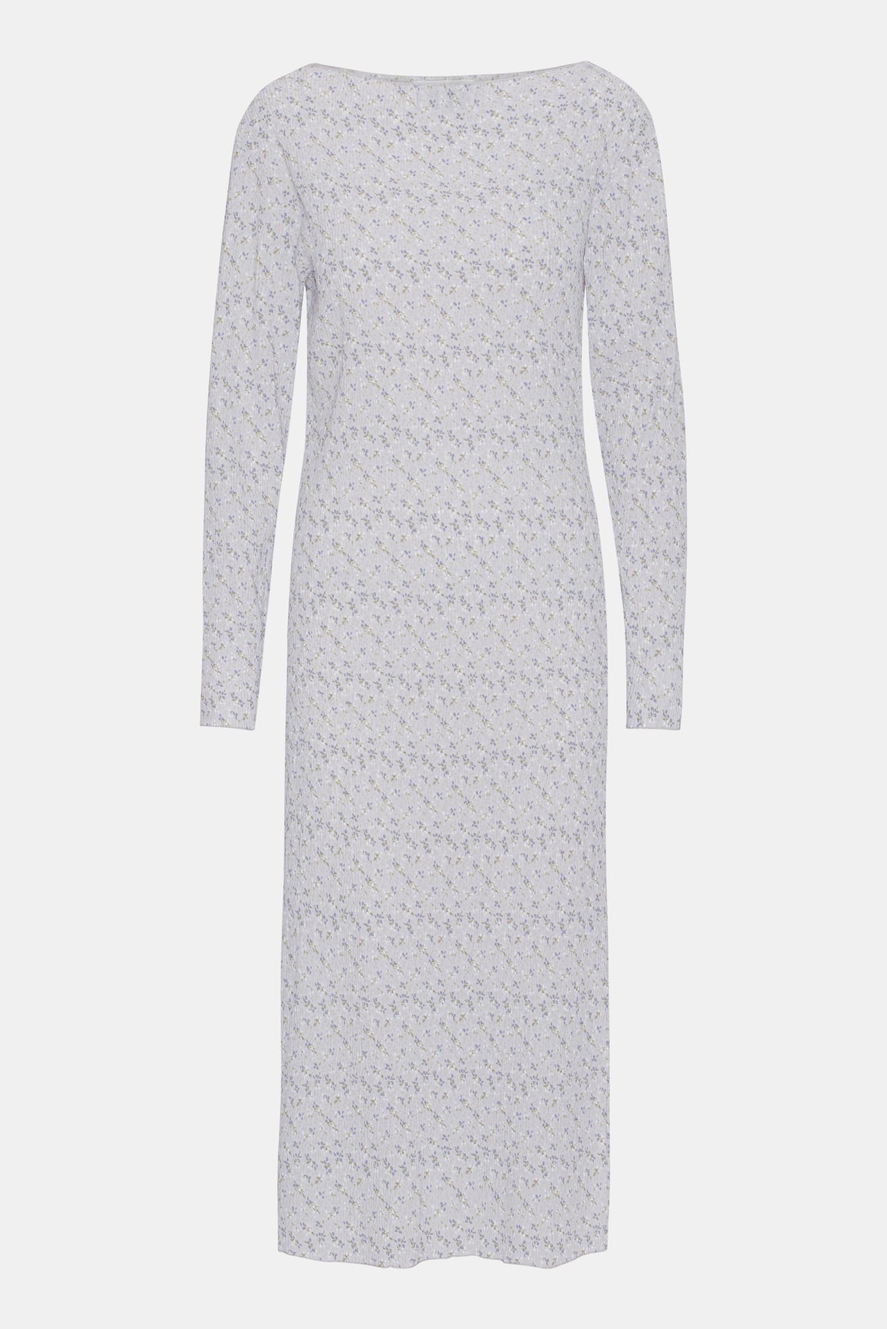 Vacker plisséklänning i blått blommönster. Klänningen har långa ärmar och en rund halsringning, båda prydda med ömtåliga volangdetaljer. Den har slitsar på båda sidor, vilket ger en elegant touch till designen.