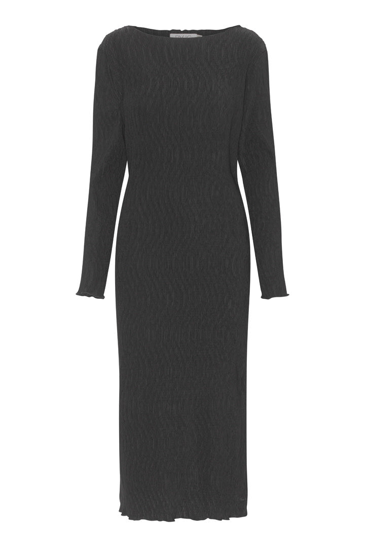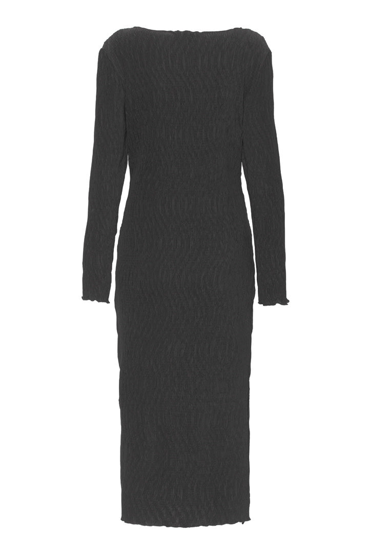 Vacker plissé klänning i svart. Klänningen har långa ärmar och en rund halsringning, båda prydda med ömtåliga volangdetaljer. Den har slitsar på båda sidor, vilket ger en elegant touch till designen.
