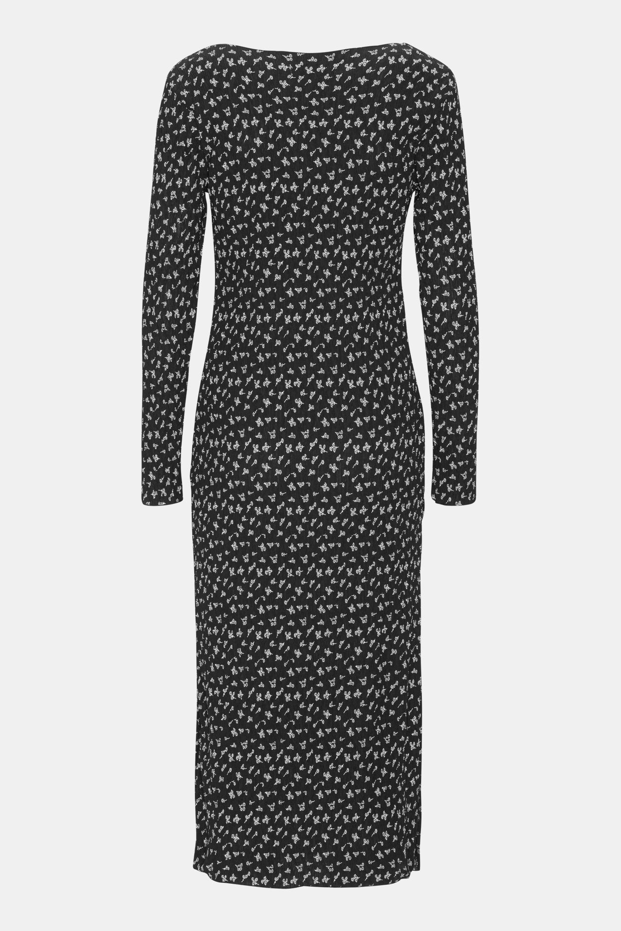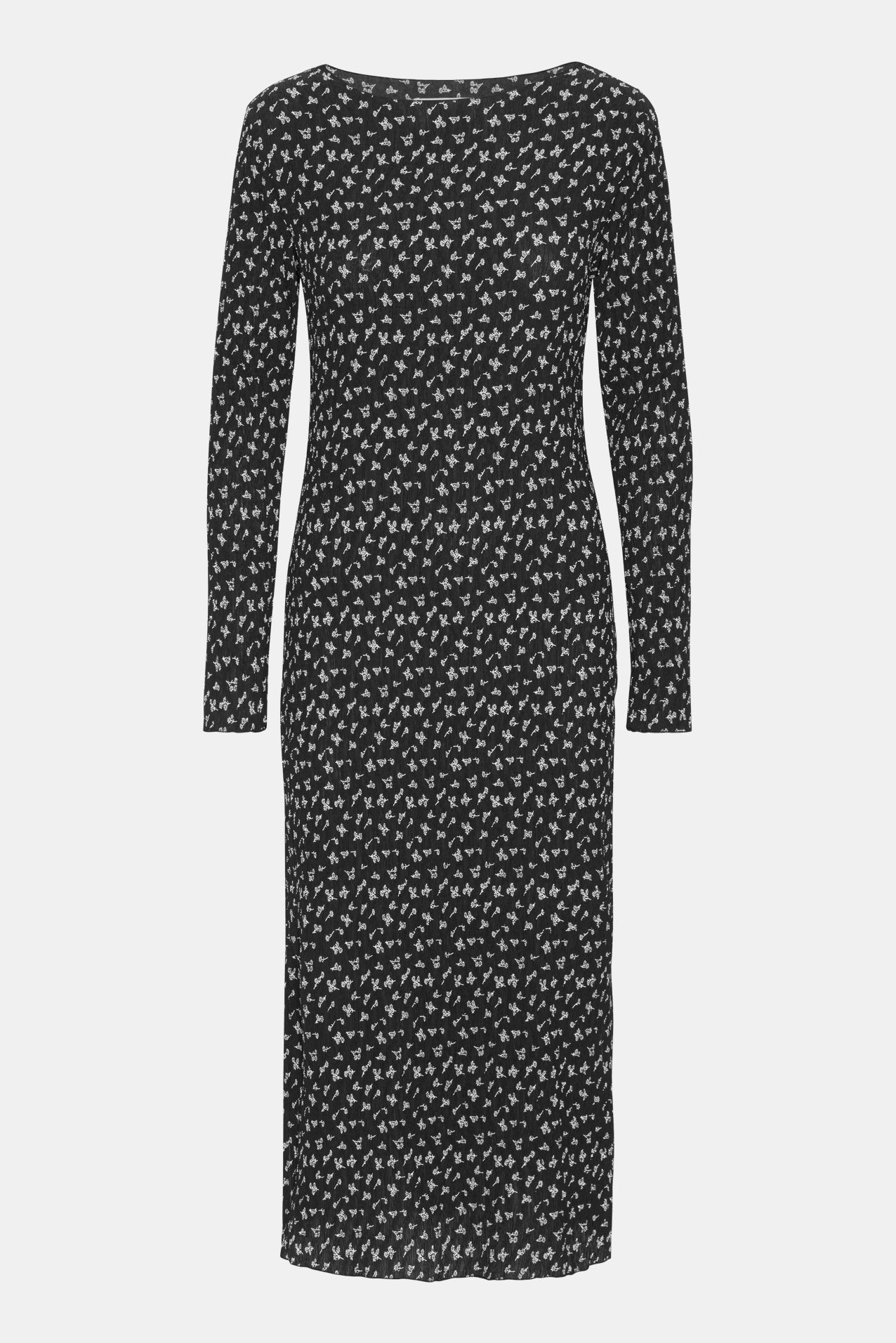 Vacker plissé klänning i svart blommönster. Klänningen har långa ärmar och en rund halsringning, båda prydda med ömtåliga volangdetaljer. Den har slitsar på båda sidor, vilket ger en elegant touch till designen.