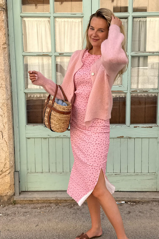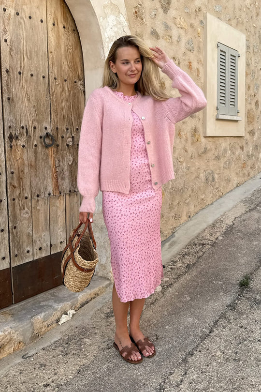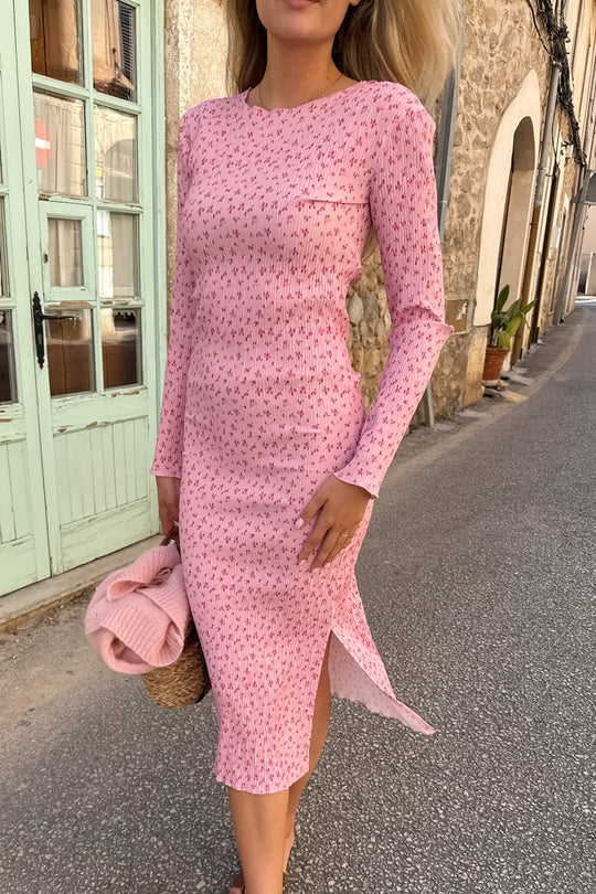 Vacker plissé klänning i rosa blommönster. Klänningen har långa ärmar och en rund halsringning, båda prydda med ömtåliga volangdetaljer. Den har slitsar på båda sidor, vilket ger en elegant touch till designen.