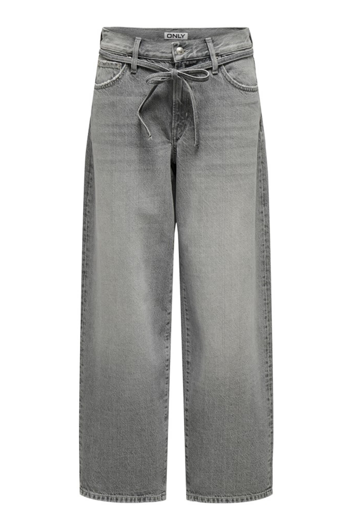 Grey denim jeans with a loose fit and a tie.
