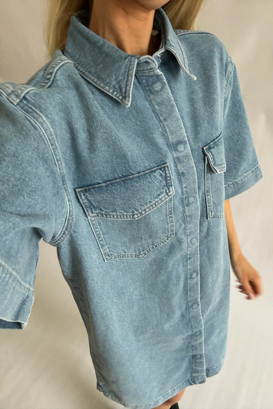 Denim shirt dress with short sleeves, two chest pockets and push buttons as closure.