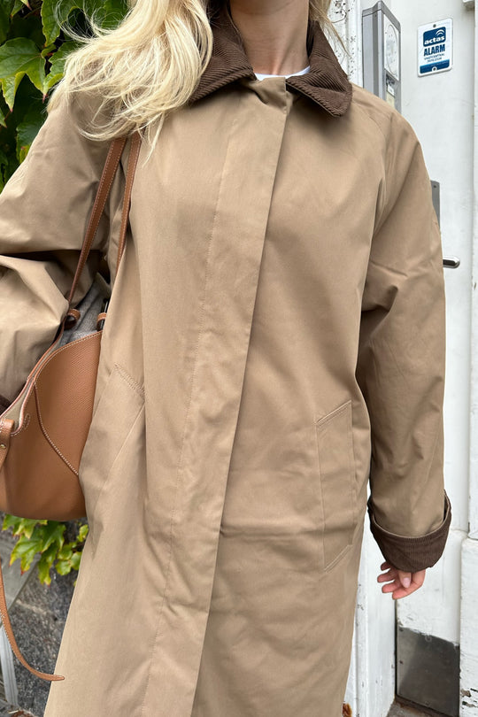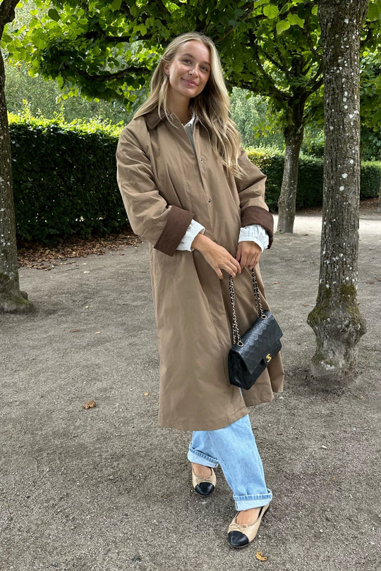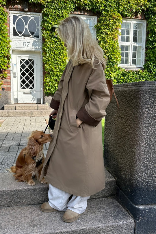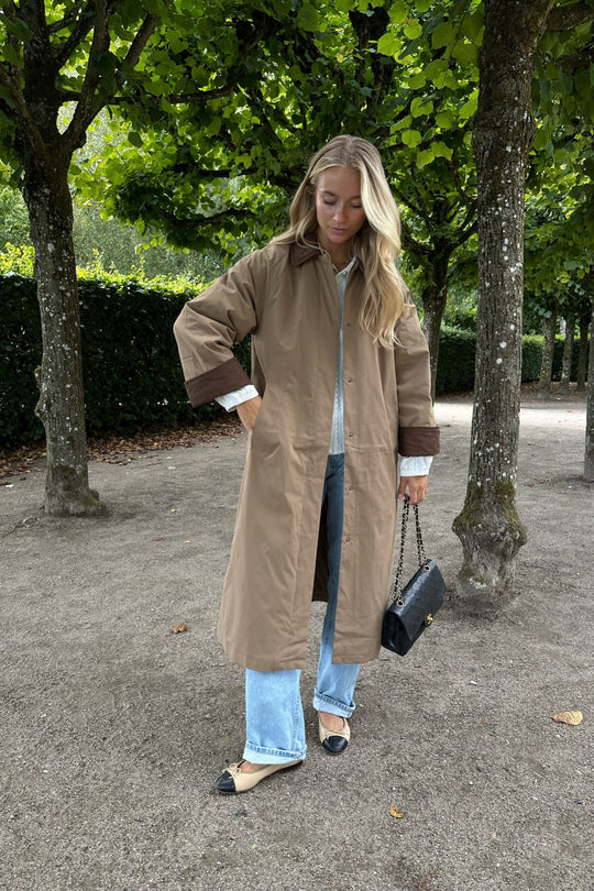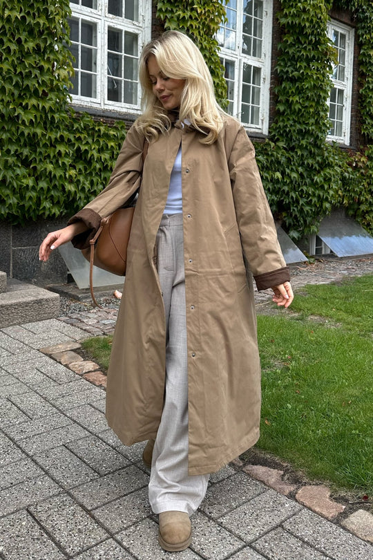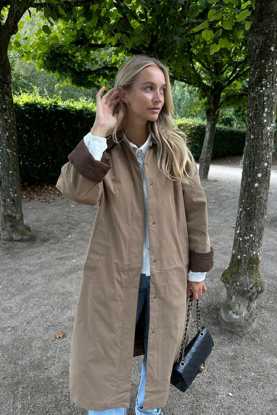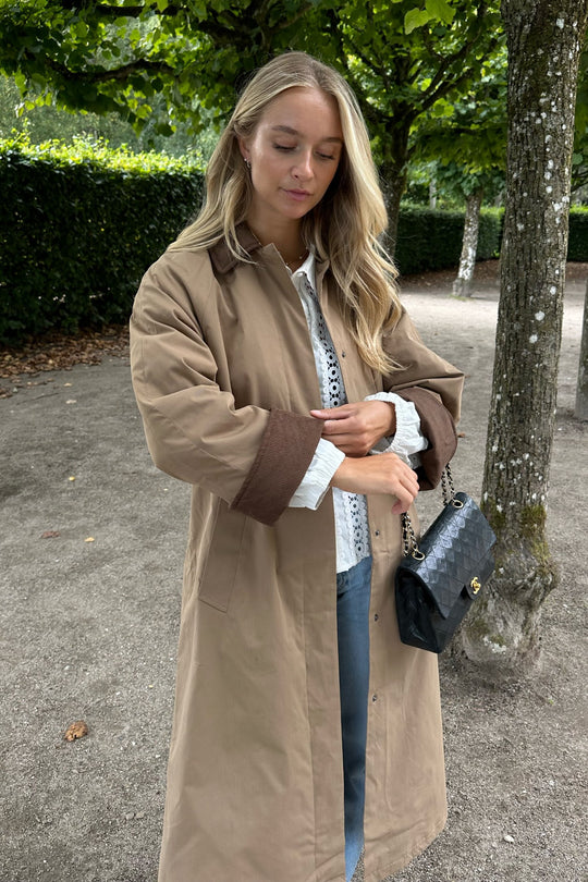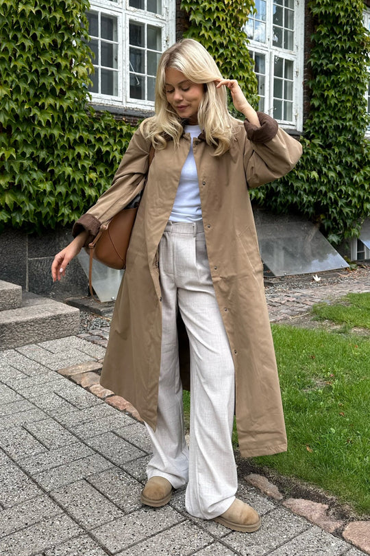 Oversized trenchcoat with a collar, big sleeves, a slit on the back and pockets. Push buttons as closure.
