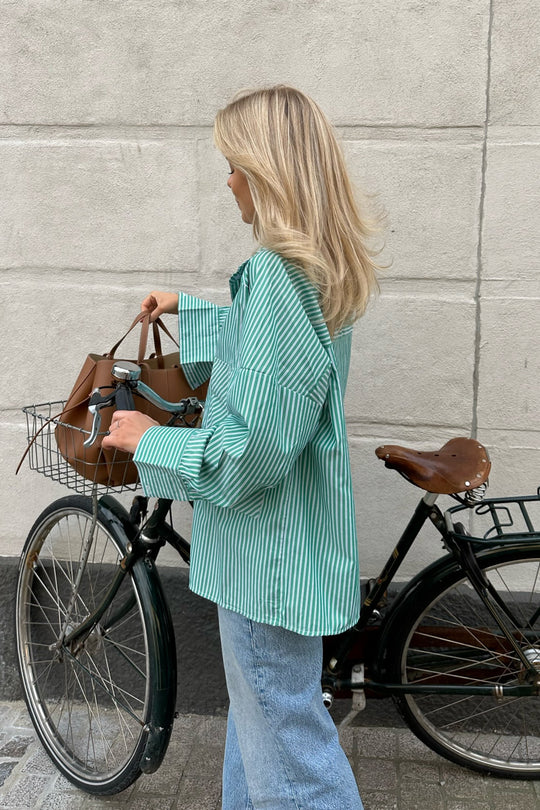 Shirt with green stripes as well as thin dotted blue ones. It got long cuffs, two big pockets in the front and has an oversized fit.