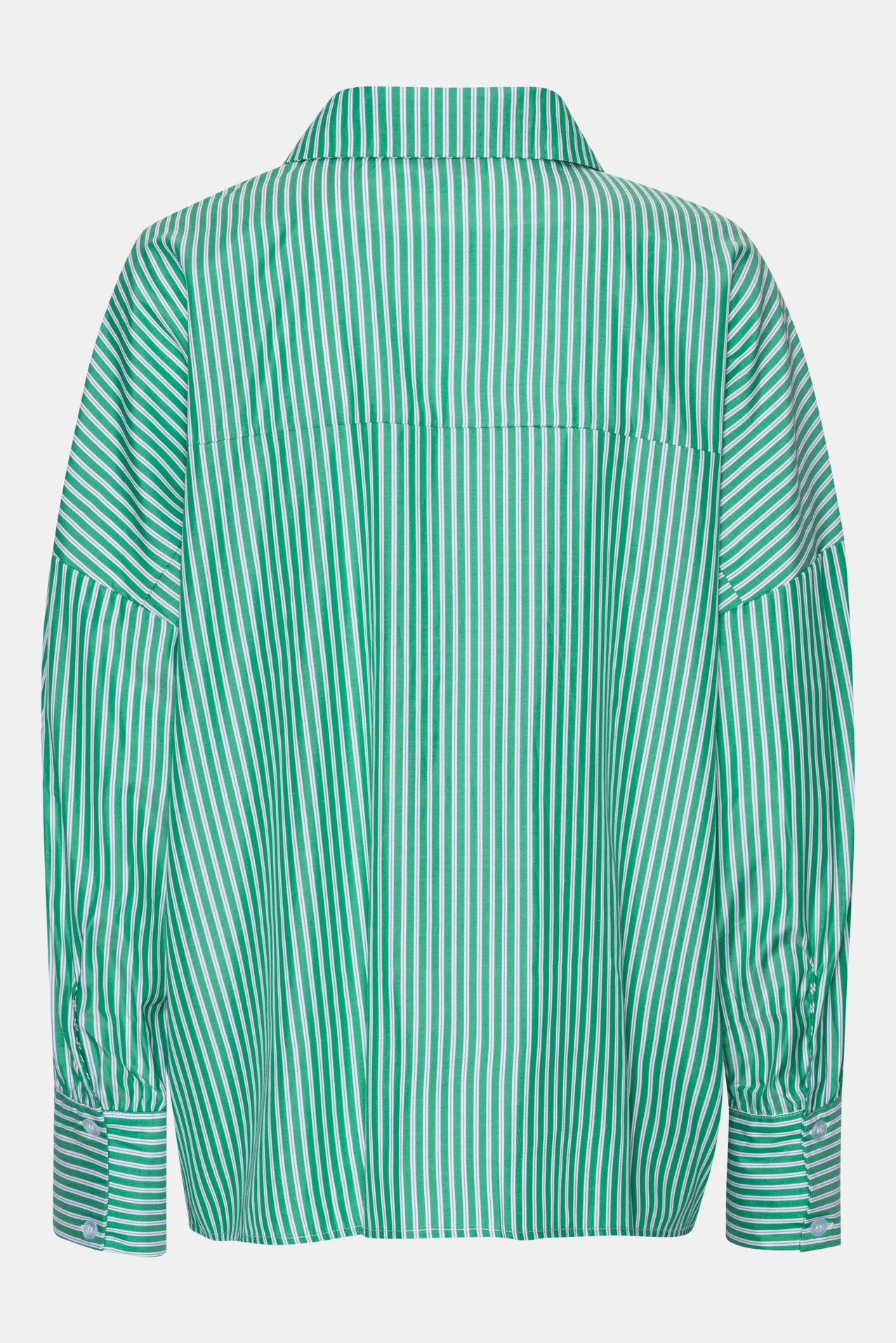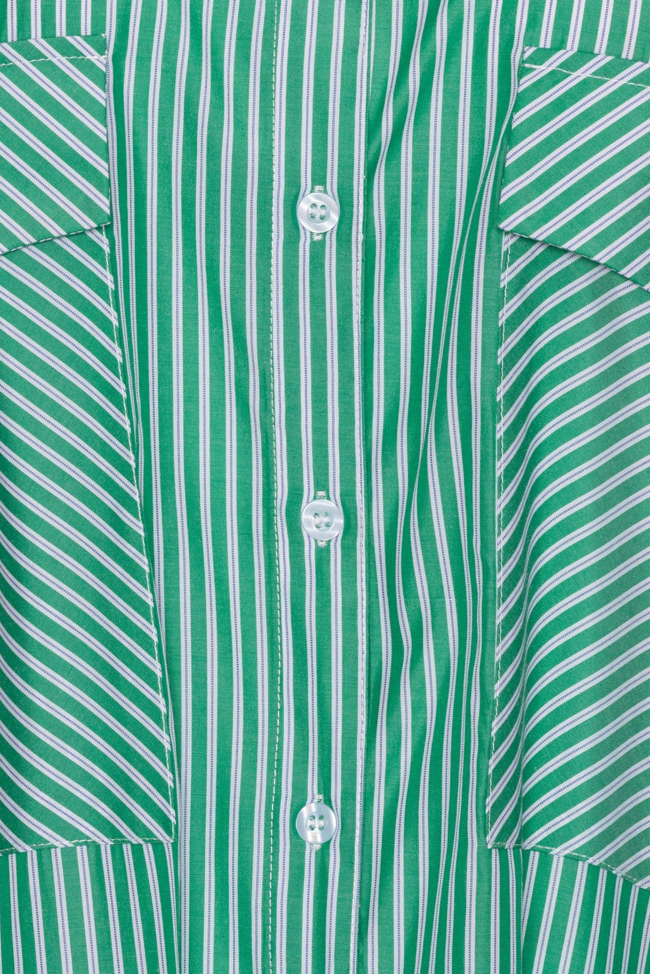Shirt with green stripes as well as thin dotted blue ones. It got long cuffs, two big pockets in the front and has an oversized fit.