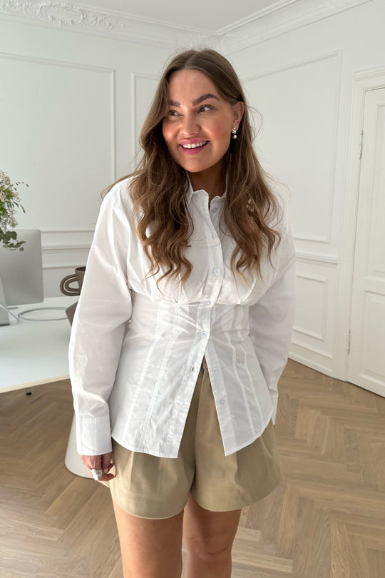 Formfitting shirt in classic white, buttons a long the front and long cuffs.