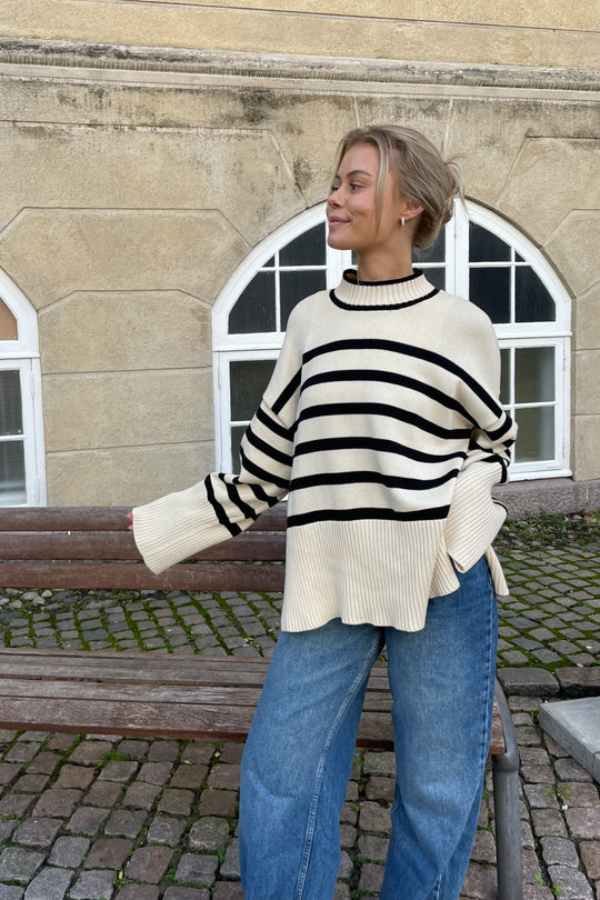 High neck pullover in beige with black stripes, long sleeves and a loose fit.