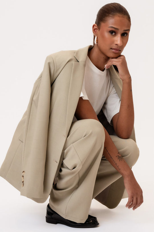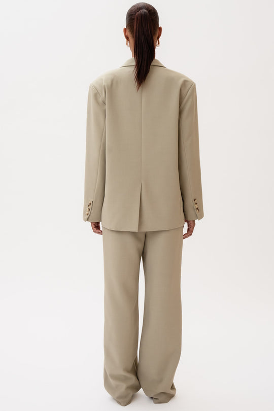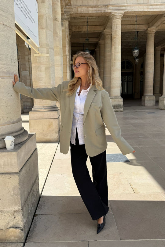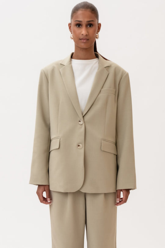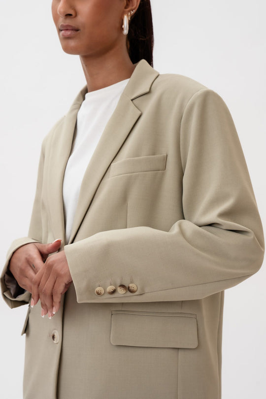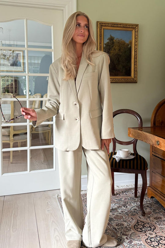 Dammig beige kavaj i ett vackert tyg. Den har en rak passform och raka ärmar med knappdetaljer vid ärmsluten. Det finns en ficka på vänster bröst, två framfickor nedtill och en skjortkrage som går ner i ett V framtill, där två knappar fungerar som stängning. En slits baktill ger en elegant touch till helhetsintrycket.