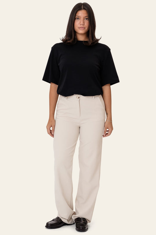 Ett par klassiska byxor i vit ton med en elegant, minimalistisk look. De har en rak, lätt avslappnad passform med bälteshällor, sidofickor och två fuskfickor bak för en ren och sofistikerad finish. Tillverkade av ett mjukt och lätt tyg med en touch av stretch för komfort och rörelsefrihet hela dagen. Dessa lätta byxor är perfekta för både kontoret och vardagsbruk. Styla med en enkel topp eller en lätt skjorta för en tidlös och elegant outfit.