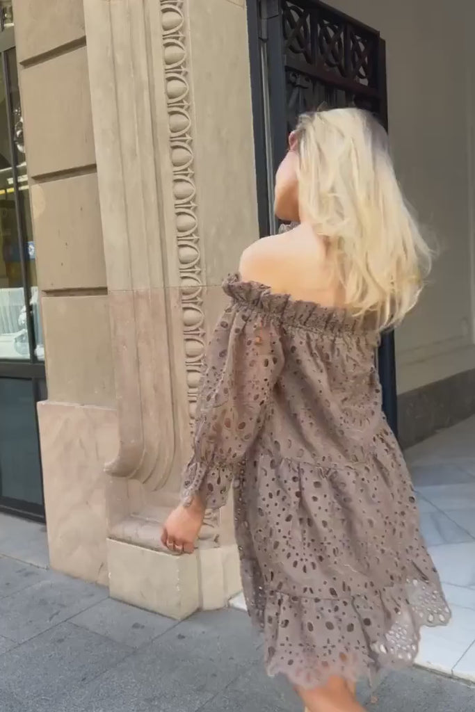 Off shoulder dress in brown with short sleeves and sewn in slip dress.