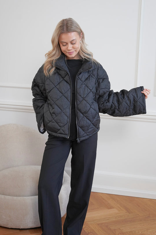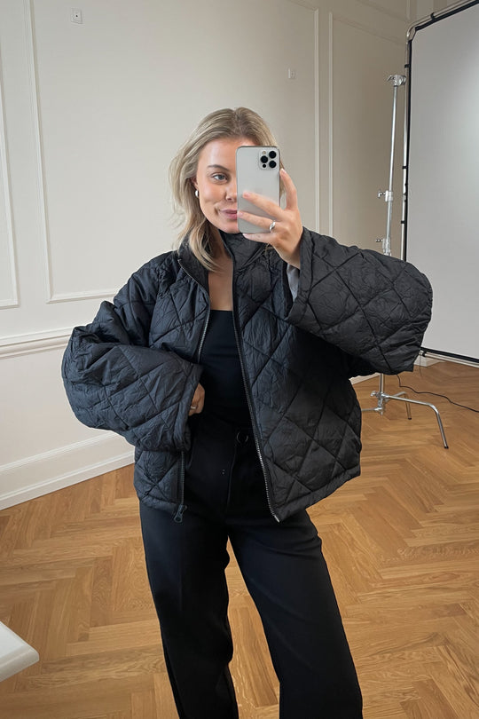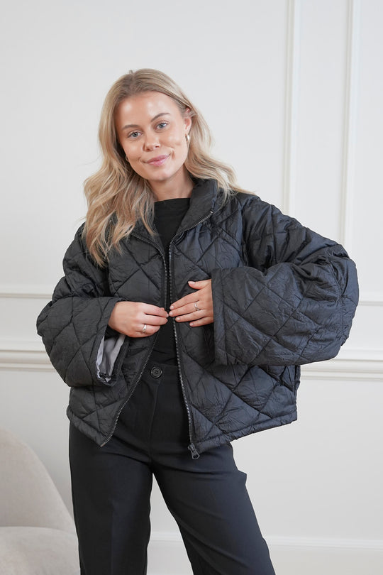 Quilted jacket with a zipper, big sleeves and a short fit.