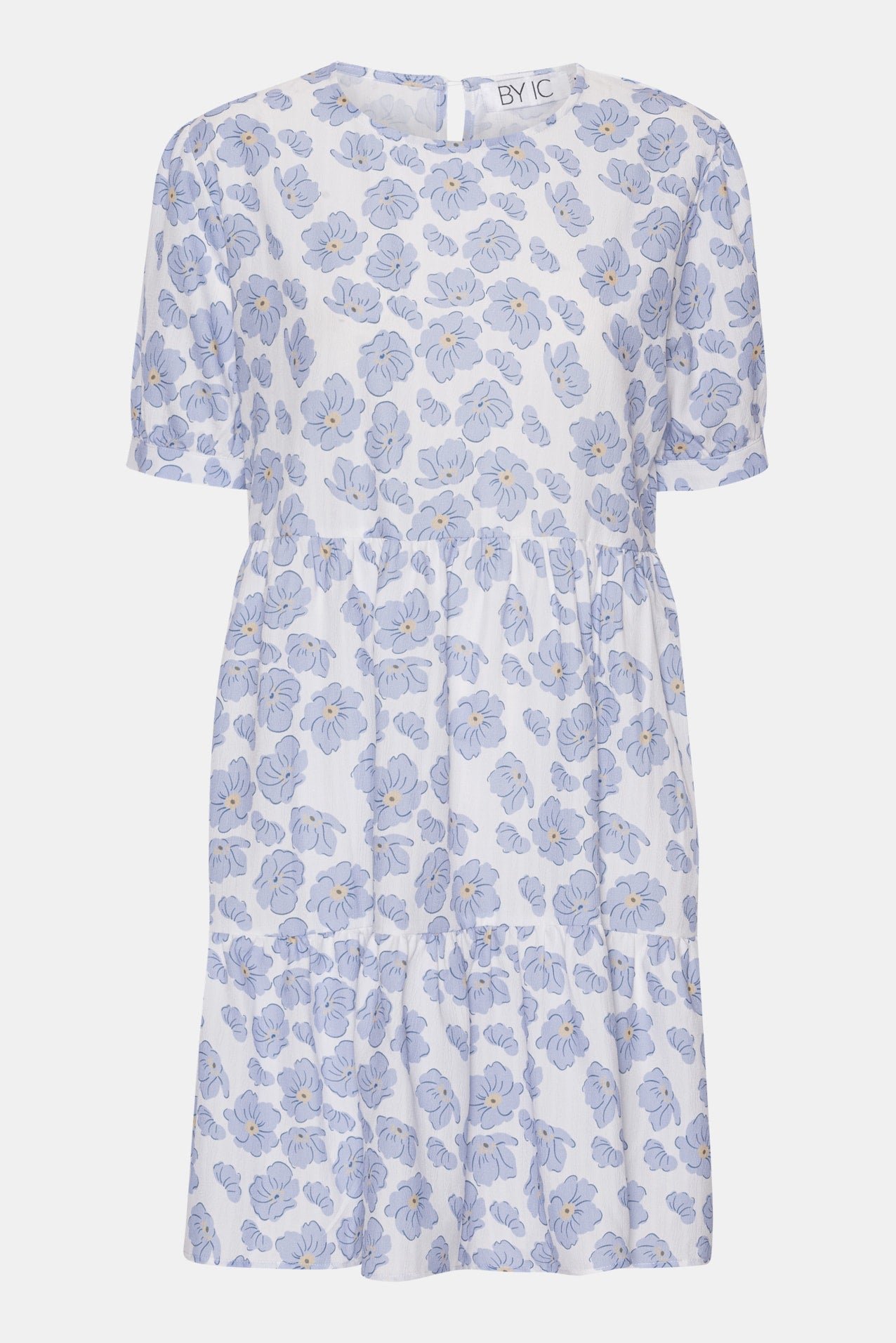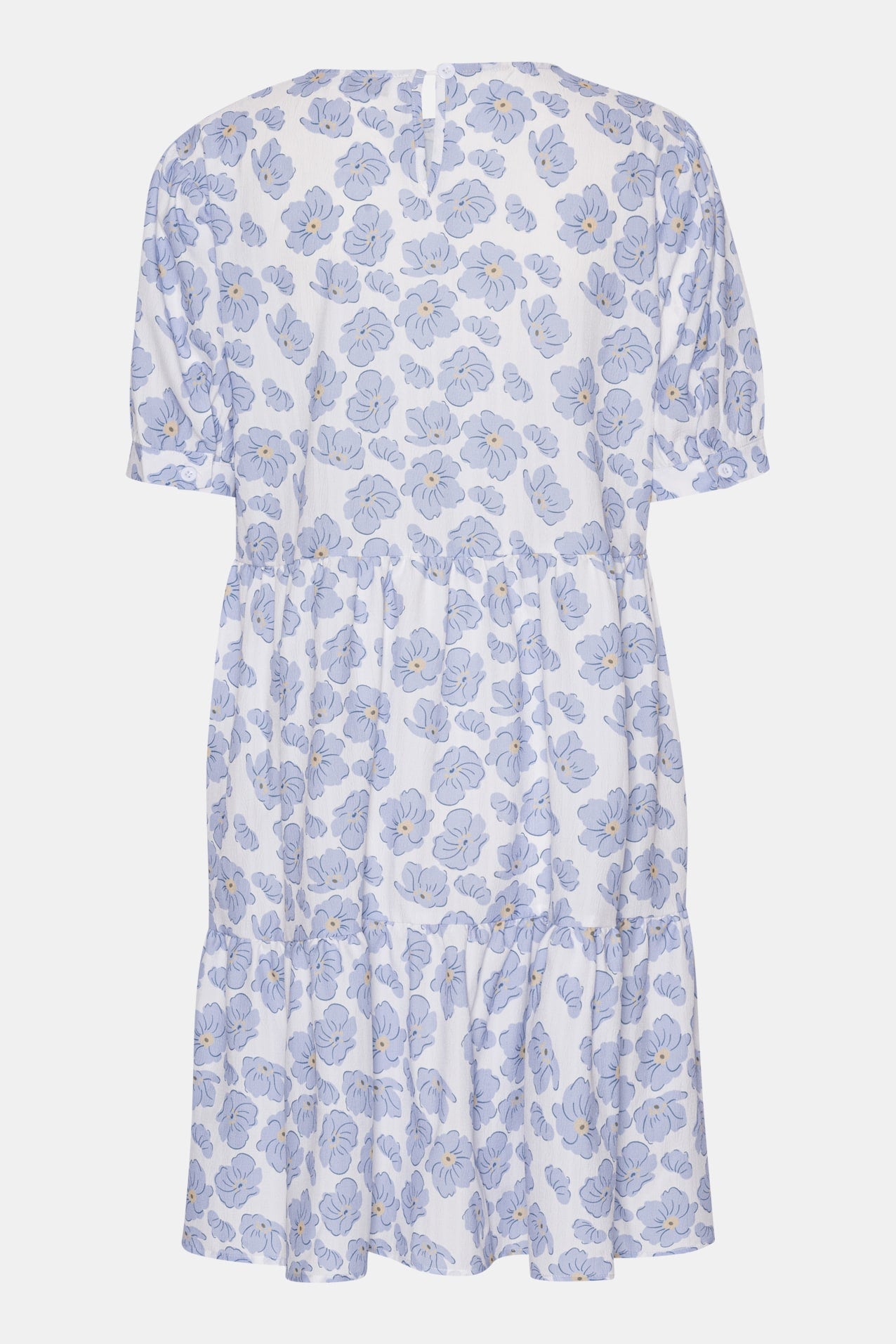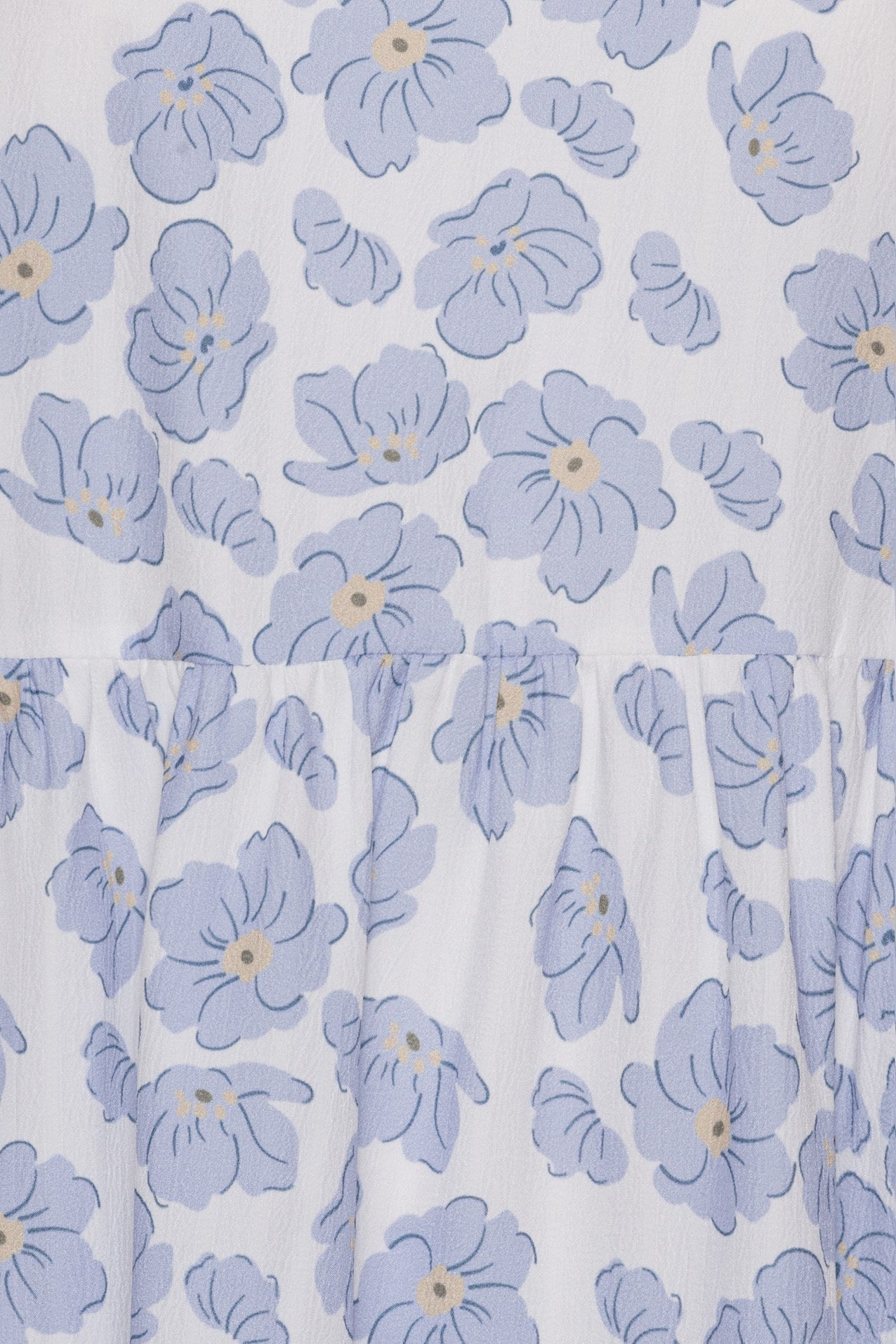 Loose fitted dress with big blue flowers, puffy, short sleeves and has a buttons as closure.