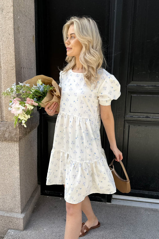 Loose fitted dress with small blue/light purple flowers, puffy sleeves and has a buttons as closure.